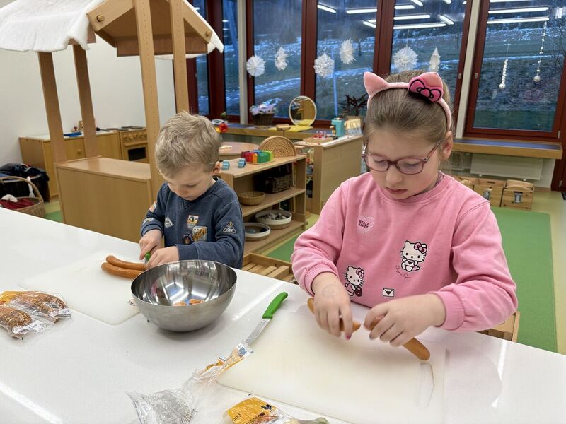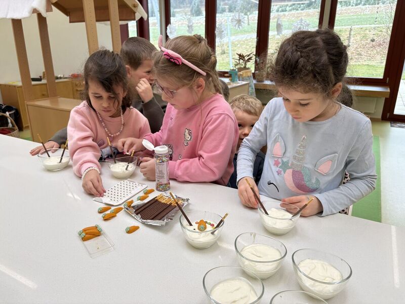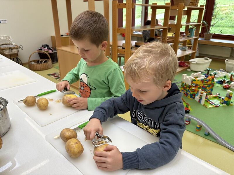 Jeweils vor den Ferien dauert der Kindergarten für die Schmetterlingskinder bis über Mittag, denn wir bereiten unser Mittagessen gemeinsam im Kindergarten zu. Jedes Mal steht ein Gemüse oder eine Frucht im Zentrum. Die Kinder rüsten, schälen, schneiden, mixen, rühren,... bis das Essen mit Vorspeise, Hauptgang und Dessert zubereitet ist.